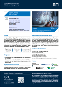 In its unique cross-thematic and cross-faculty approach, our continuing education program Digital Twins for Cities combines the fields of digital building (BIM) and digital urban modeling (CityGML) with innovative analysis and simulation methods for designing “smart” urban spaces with quality of life. Practical application scenarios from municipalities and metropolises give impulses for the own implementation.The next course starts on October 7th 2022.